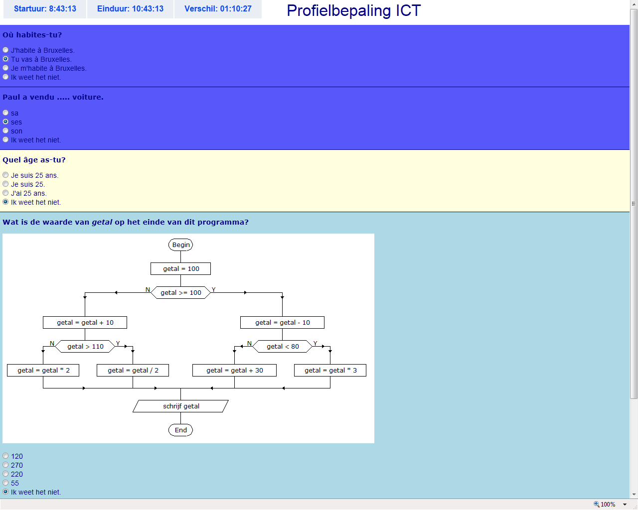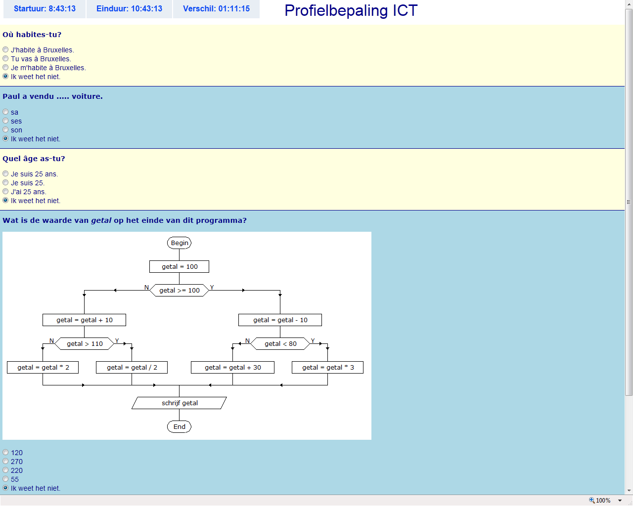 Elke vraag, die je beantwoordt, krijgt een blauwe achtergrondkleur. Ook als je het antwoord niet weet, klik je op het bolletje voor “Ik weet het niet”.